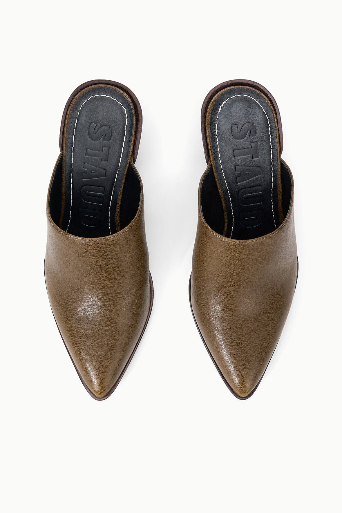 The Austen Mule is a western-inspired slip-on mule. featuring a chunky block heel and a pointed toe.